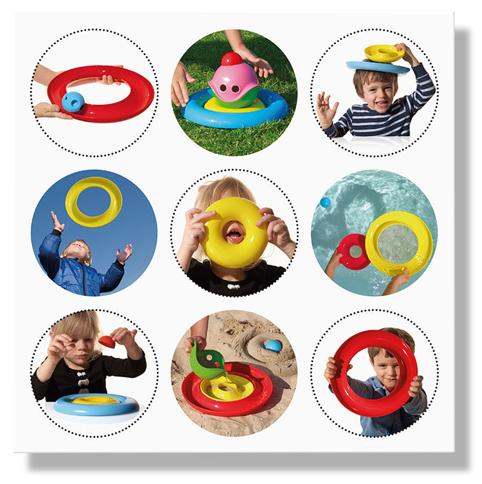 Nello is a magic object and versatile, open-ended toy that quickly becomes an indispensable accessory for countless play activities, indoors and outdoors. It is a color puzzle, a nesting toy, a marble run, a floating island in the bath or a sand toy at the beach. You can roll, spin and swing the rings, throw and catch them. Use them as targets for games like tiddlywinks or as beautiful props for role and pretend play.