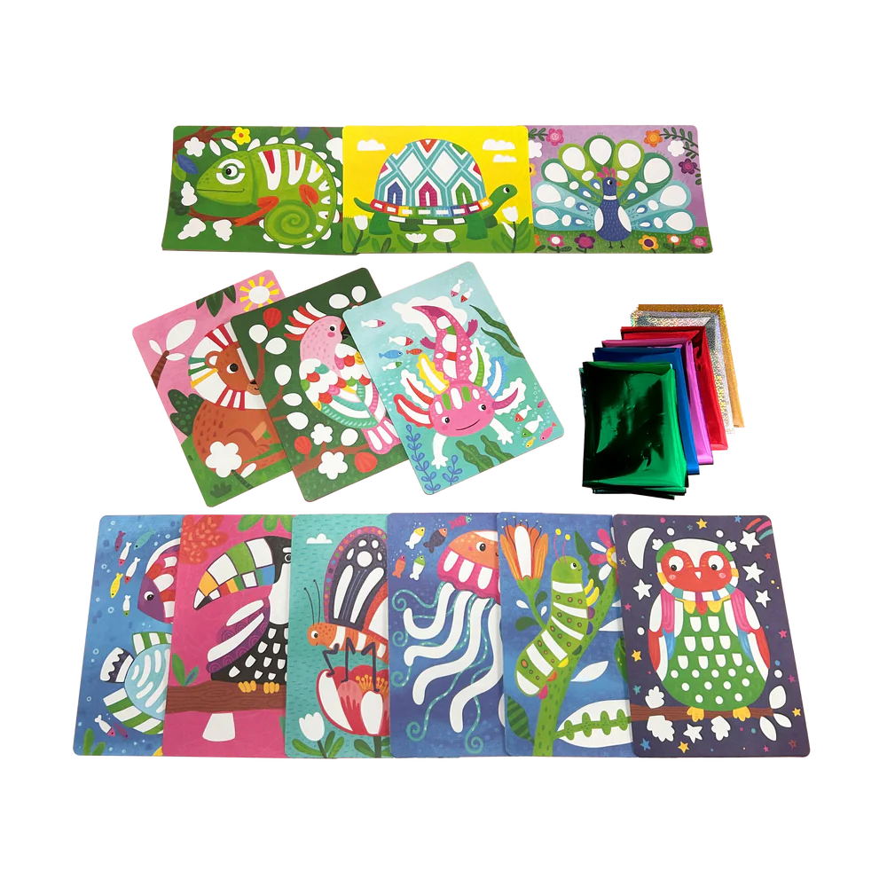 - Foil art kit with awesome animal designs - just peel, stick, and shine