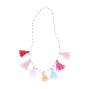 Bright tassels add a playful touch to a delicate beaded necklace. Worn with jeans and a tee or even a colorful sundress, this necklace provides artistic flair to any outfit.