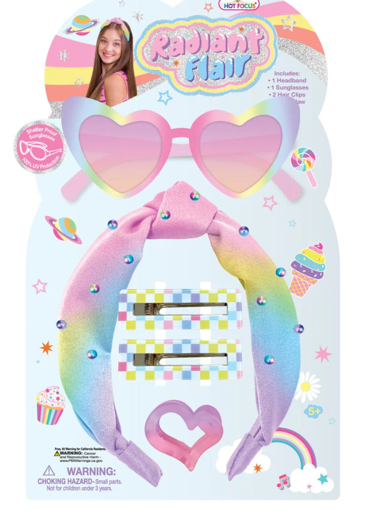 The Radiant Flair Rainbow set is the perfect gift for girls who love to add a colorful touch to their style. This set includes a pair of fun heart-shaped sunglasses and a selection of hair accessories. Bring a touch of joy and brightness to any outfit with this fun and trendy set.