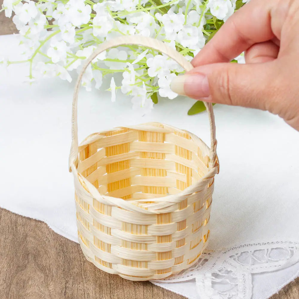 This Mini Bamboo Basket with Handle is a charming addition to any celebration or decor. Made from woven rattan, it brings a natural touch to Easter, weddings, and baby showers. Basket: 3" Diameter x 2" H Height w/Handle: 5"