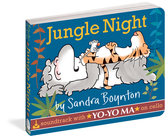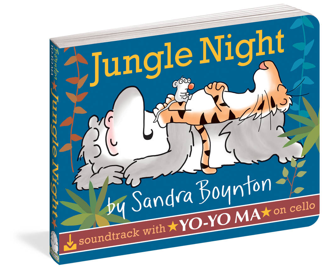 Two celebrated artists come together for JUNGLE NIGHT, a soothing bedtime board book. (Okay, MOSTLY soothing.) The book guides us through the jungle to hear the distinctive, gentle snore of each animal: "Listen to the tiger: ZEEE-ZOOO-HAAA. Listen to the cheetah: CHEE-CHEE-TAAAH." A free downloadable JUNGLE NIGHT recording offers a narration of the book, with each and every animal snore interpreted by the expressive, playful cello of Yo-Yo Ma. He even does the elephant's stop-the-show snore—though admittedly that took Ma's cello PLUS the classic horn salute of the James R. Barker steamship. (Seriously.) All of this fabulousness leads into the coolest lullaby ever: "Jungle Gymnopédie No. 1", a polyrhythmic jungly arrangement by Boynton of Erik Satie's renowned piece, with Yo-Yo Ma on cello, guitar played by Ron Block of Alison Krauss Union Station, and drums by Kevin MacLeod. "Yo-Yo and I chose this piece because it's the most gorgeous and mesmerizing night song imaginable," explains Boynton. "And there was surely nothing else that could get those animals back to sleep after that elephant blast."