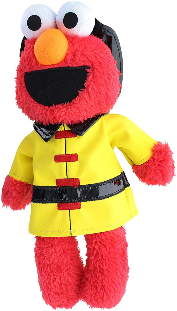 - Our 13-inch Take-Along Buddy style Elmo is dressed up as a firefighter in his shiny black and yellow coat and matching hat on top.