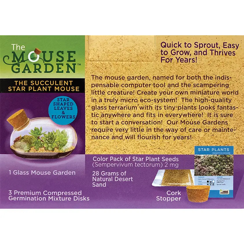 The mouse garden, named for both the indispensable computer tool and the scampering little creature! Create your own miniature world in a truly micro eco-system! The high-quality glass terrarium with its tiny plants looks fantastic anywhere and fits in everywhere! It is sure to start a conversation! Our Mouse Gardens require very little in the way of care or maintenance and will flourish for years!