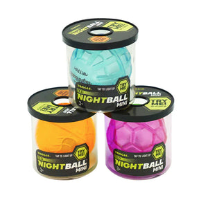 Light up the Night with the Tangle NightBall Mini! Available in many colors, the Mini balls are perfect for light up fun at home or on the go. Super bright LEDs inside each ball and illuminate brightly with every kick, bounce, and throw. Each Mini ball is approximately 2" in diameter.