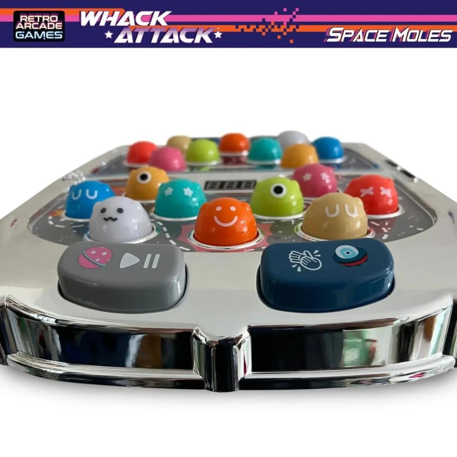 The Whack Attack Space Moles game brings the retro arcade game fun! Fun chrome colored game board has 1 or 2 player modes with lights and sounds. Includes game board, 2 hammers, 6 coins and an LCD score display. 36 levels of fun! Requires 4 x aa batteries (not included)