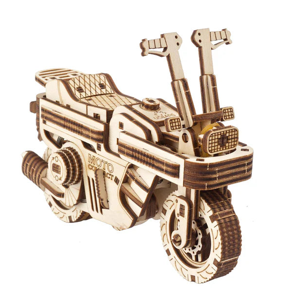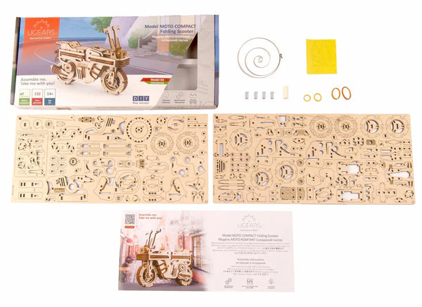 The Moto Compact folding scooter from UGears is a clever, spring-driven addition to our family of two-wheeled DIY wooden models. For many youths, a motor scooter is their first form of motorized transport. It represents freedom, mobility, a fun way to get to school, activities, a first job. It's a ticket to explore the world beyond the neighborhood where you grew up. Capture that feeling of youthful freedom when you build this smart little folding scooter.